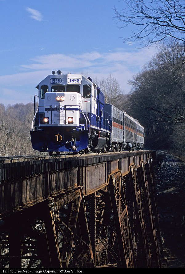 Paducah and Louisville's University of Kentucky inspired GP38-2 leads an office car special back to Paducah as it crosses Poplar Creek trestle near Westpoint Ky.