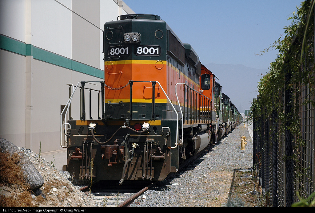 SD40-2s as far as the eye can see - a long string of BNSF SD40-2 locomotives sits behind a warehouse in Fontana, California, awaiting either an upturn in business, or sale to a railroad that needs them. There are at least 26 units in this line, and another shorter string on an adjacent track.