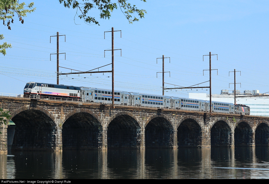 | While waiting for the Cake Boss Acela to make an appearance, the Northbound ACES train from Atlantic City crosses into New Jersey from Pennsylvania on a classic PRR built bridge. |