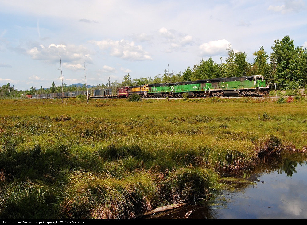 Seven miles from Brownville Junction, Job 2 rolls through some wetlands in Barnard on the Moosehead Subdivision. This train has a one-man-crew and a remote control caboose, which is not uncommon on MMA. I believe the peak in the distance is Benson Mountain.