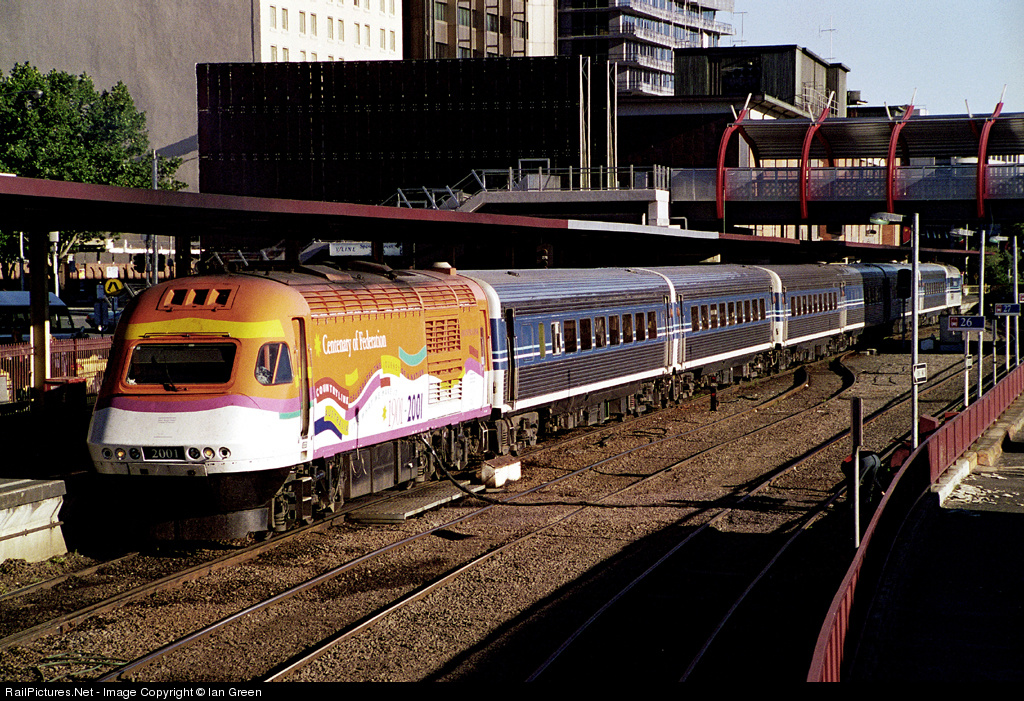 The overnight Melbourne to Sydney XPT service refuels on platform 1. The lead power car wears a special livery to celebrate the Centenary of Federation (1901-2001).