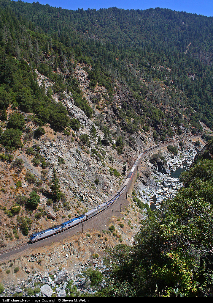 The aptly named Feather River Express scales the canyon and skirts the North Fork Feather River, bound for Portola, with two P42's and fourteen private cars behind. The train was originally scheduled to have UP 1983 and 1996 leading the train, but Amtrak screwed the pooch and failed to put them on the train in Oakland.. A real disappointment, especially since the lead P42 is a rust bucket.. Two points for you, Amtrak!