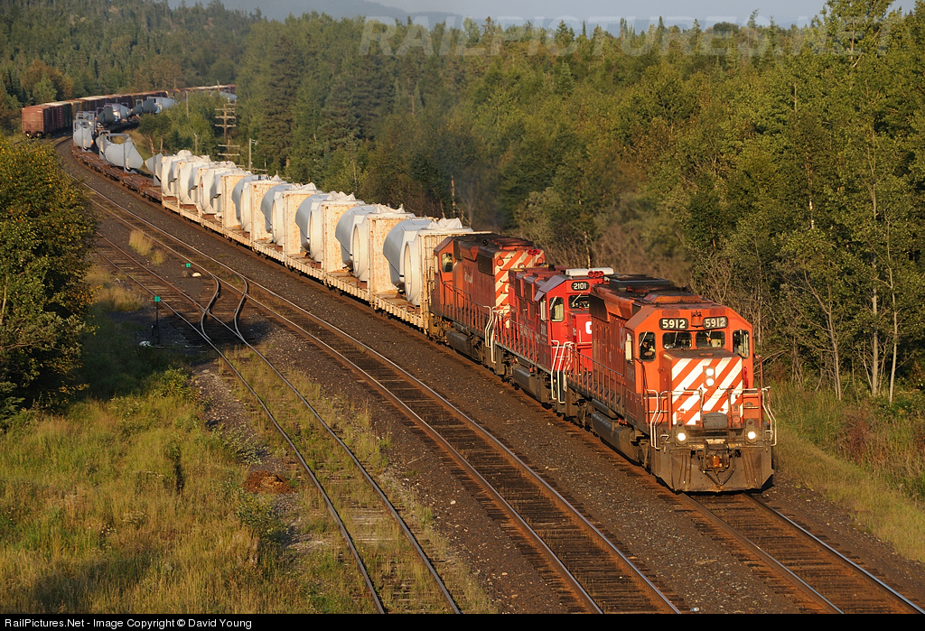 Running into the golden light from a setting northern sun, a Windsor, ON to Virden, MB windmill special rolls through Terrace Bay with 44 cars of windmill parts. Leading this train are two of CP's veteran SD40-2's CP 5912 and CP 6079 sandwiching the next generation of "low emission" diesel engine, CP 2101.