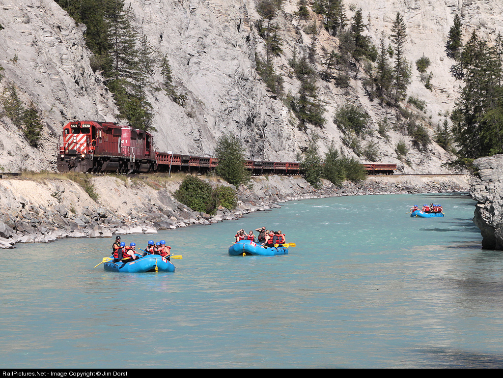 Coming out of the Kicking Horse Canyon, rafters take a leisurely float at the end of the trip. Meanwhile, the work train crew leisurely wait for CP 217 to clear the east end of the yard. Taken using a circular polarizer.