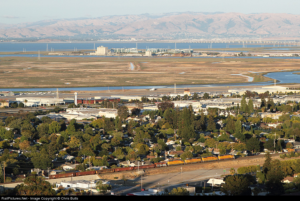 | UP's Mission Bay Local heads south on the CalTrain Peninsula line through San Carlos CA late Sunday afternoon. The longer days of summer make getting pictures of freights in daylight possible. In the background is San Carlos Airport, the port of Redwood City and the Dumbarton Bridges. |