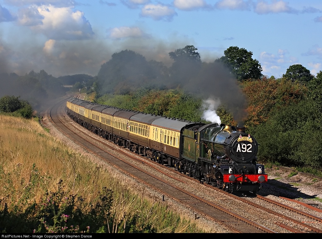| Ex GWR King class 6024 King Edward I makes a fine sight passing Compton Beauchamp with the Bristolian railtour from Bristol to London Paddington. A matching set of WR chocolate and cream stock helps enourmously, only the second carriage (a late 1960's Mk2) spoils the late 1950's period look. A welcome change to the rainbow appearance of most railtours these days |