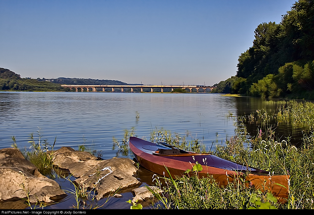 In this seldom seen vantage point, NS 36A crosses the Shocks Mill bridge on the Port Road just south of Harrisburg, PA. In 1972, several sections of the original stone arch bridge collapsed during Hurricane Agnes and were replaced with the plate girder structure shown.