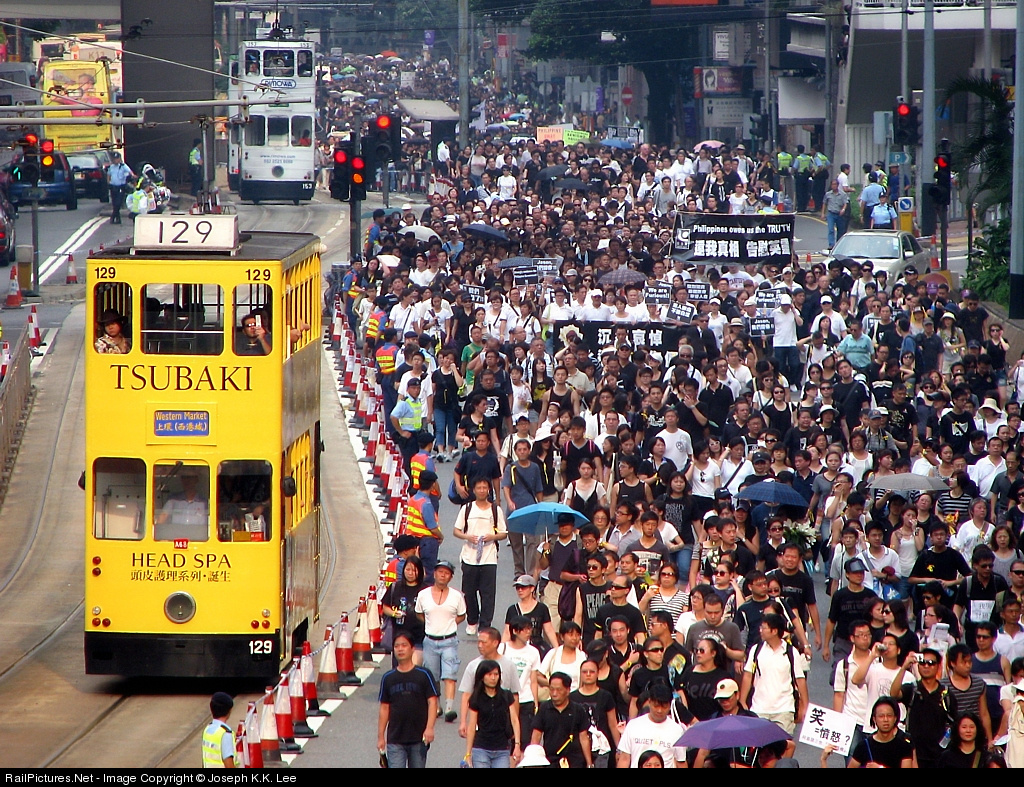 80 thousand Hong Kong people joined a rally to express their sympathies to the victims of the August 23rd hostage tragedy in Manila of Philippines. Their black or white clothes show a contrast to the colourful trams.
