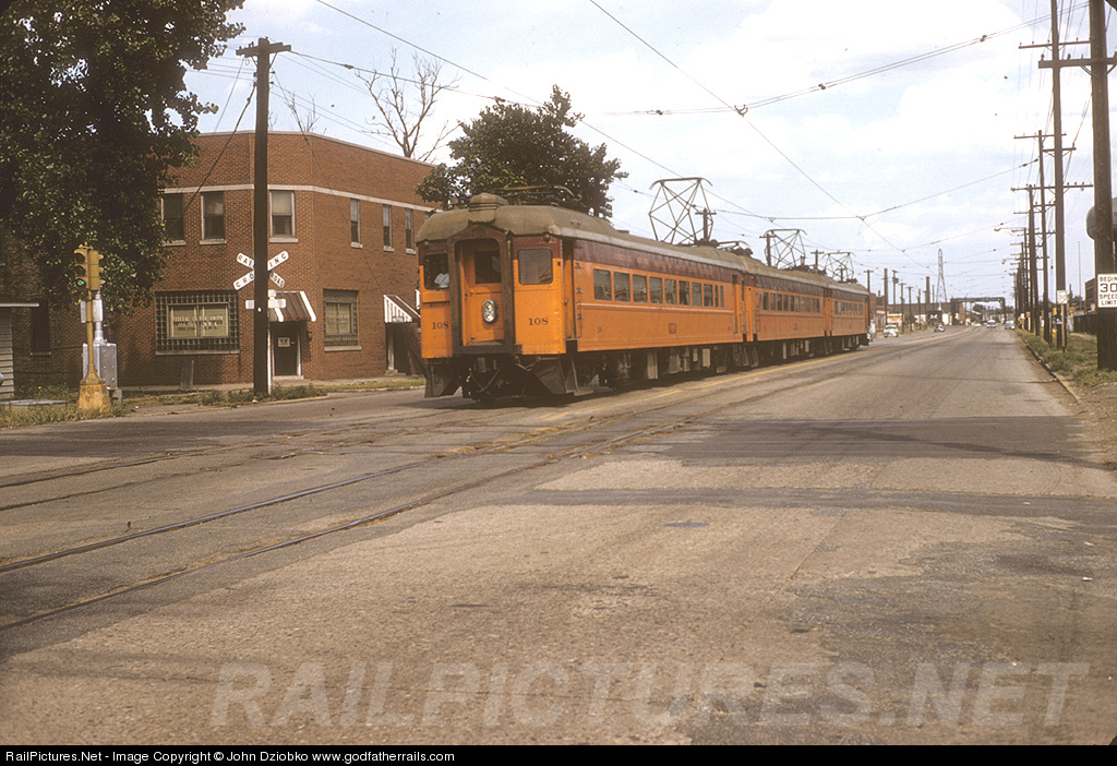 | Location believed to be Chicago Ave. at White Oak St., a 3-car South Shore train crosses the IHB in the middle of the road. This street running ended one month later. |