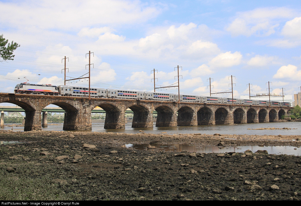 While waiting for the Cake Boss train, a NJT trained en route to New York Penn Station exits the coach yard at Morrisville, PA and crosses the river into Trenton, NJ. It was a beautiful day, and with the river being so low there were numerous fisherman out in the middle of the river, one being visible under the the first arch.