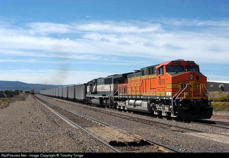 | BNSF 5610 waits at Trinidad, CO for a new crew, while another BNSF coal empty pulls ahead. |