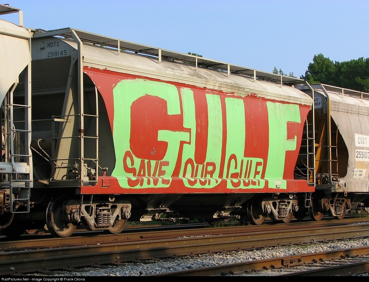 Someone has taken the time to help spread the message about the largest marine oil spill in the history of the petroleum industry by tagging this covered hopper.