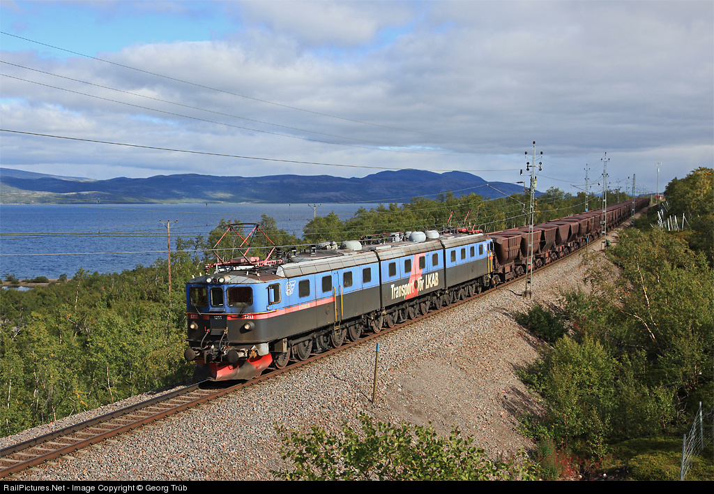 | Dm3 "Konsuln" (1211-1236-1212) with 52 loaded ore cars between Kaisepakte and Stordalen along Torneträsk lake. With a power of 7200 kW and a tractive force at starting of 940 kN the Dm3 were the most powerfull electrolocomotives worldwide for a long period. Now they are in service for more then 40 years. |