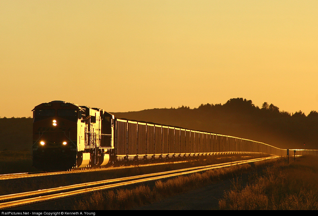 At sundown, BNSF 6282 and 8854 lift 16,874 tons of Powder River Basin coal out of the Loup River valley east of St. Michael, Nebraska.