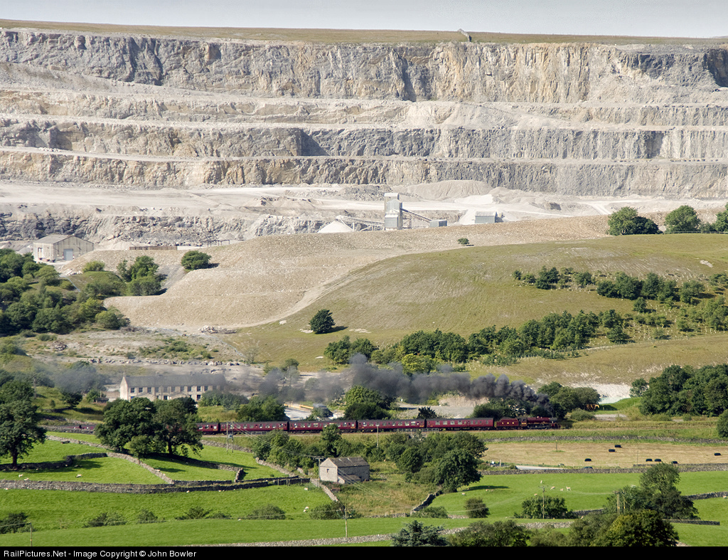 | LMS 5690 'Leander' pounds up the 'Long Drag' on the Settle - Carlisle line through the beautiful Yorkshire Dales countryside, despite mans attempt to spoil it in the form of the Quarry at Moughton, and approaches Horton-in-Ribblesdale Station with the 1Z22 'Fellsman' 0808 Lancaster - Carlisle |