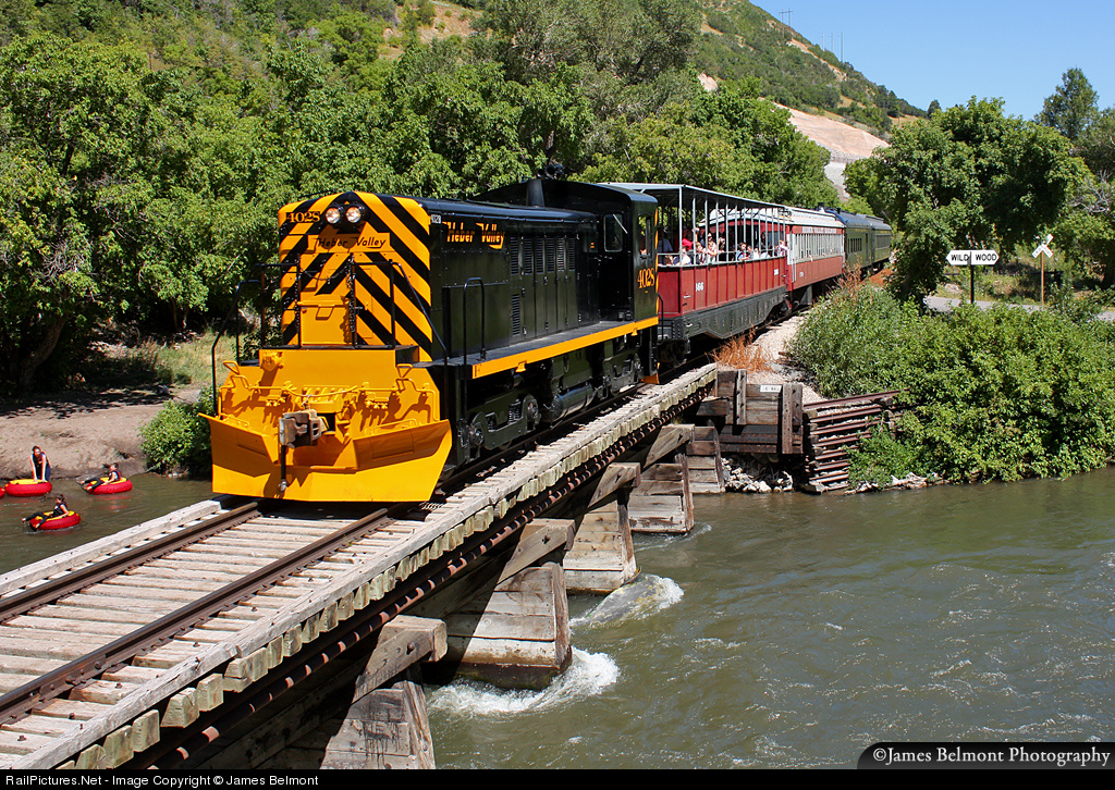Heber Valley Railroad's 'Provo Canyon Limited' crosses it's namesake river on a wood pile trestle at Wildwood, Utah. At left, a woman is assisting two young kids launch their tubes into the flowing river for a run down the canyon. Between the tourist railroad, tubing, hiking, and fly fishing, Provo Canyon can be a busy place during the summer months of the year.