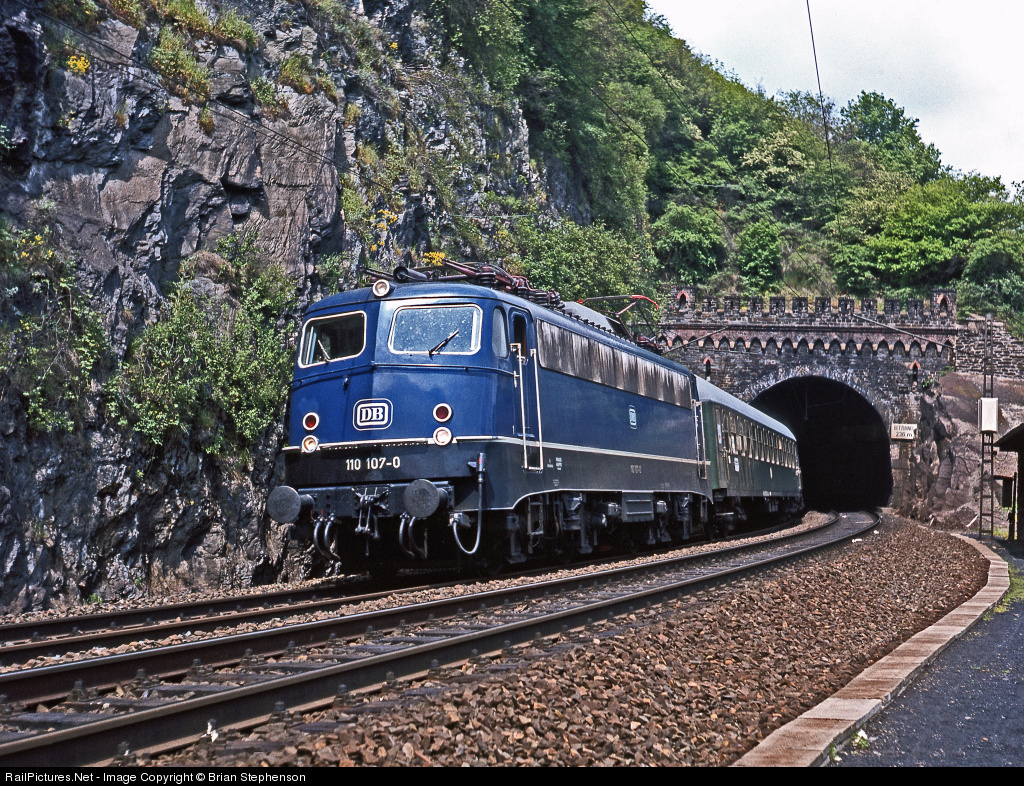 | From the first production batch of class E10 (later class 110) electric locos, No 110 107-0 has been rebuilt with a 'bugel' front in place of the orginal flat front probably as a result of accident damage. It is leaving the Bettunnel south of St.Goar on the west bank of the River Rhine with a southbound express. |