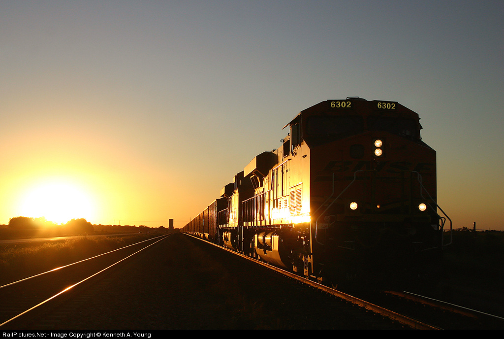 | The sun is setting on Cairo, Nebraska, as BNSF 6302 and 6033 depart with 130 loads of coal. |