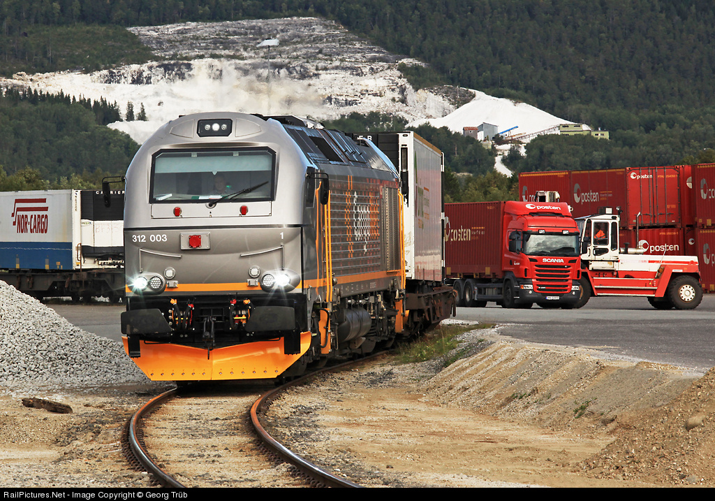 | The new Euro 4000 CD 312 003 of CargoNet is picking up some more cars with containers and trailers for train 5790 Bodø-Oslo in the container yard of Fauske. In the background a large marble stone quarry. |