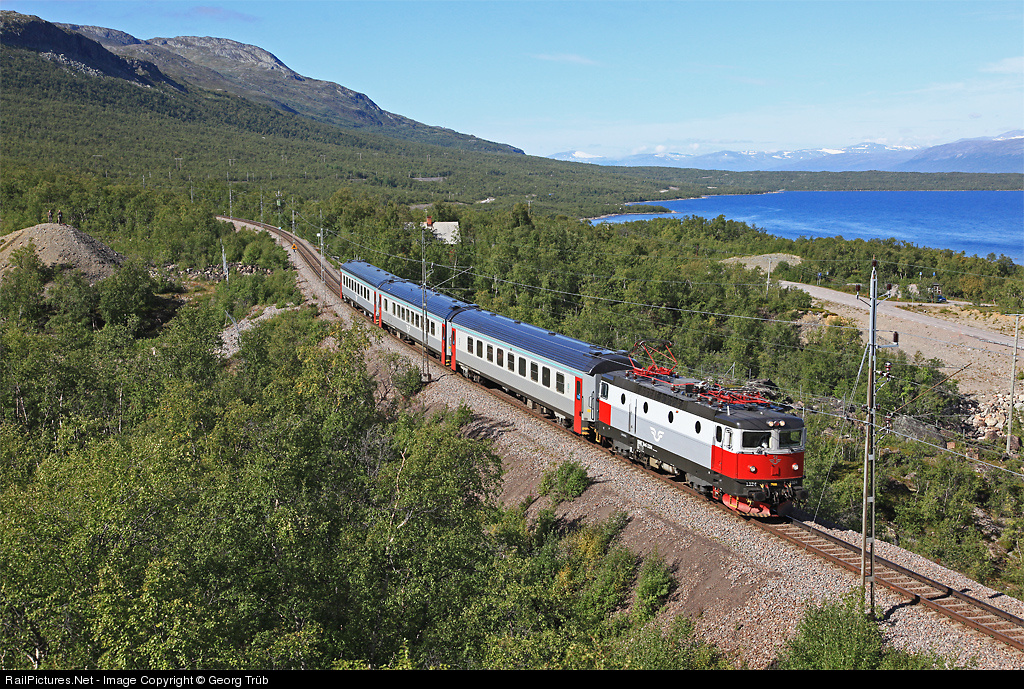 Rc6 1324 of SSRT with train 10095 Narvik-Kiruna-Lulea between Stordalen and Kaisepakte along Torneträsk lake.