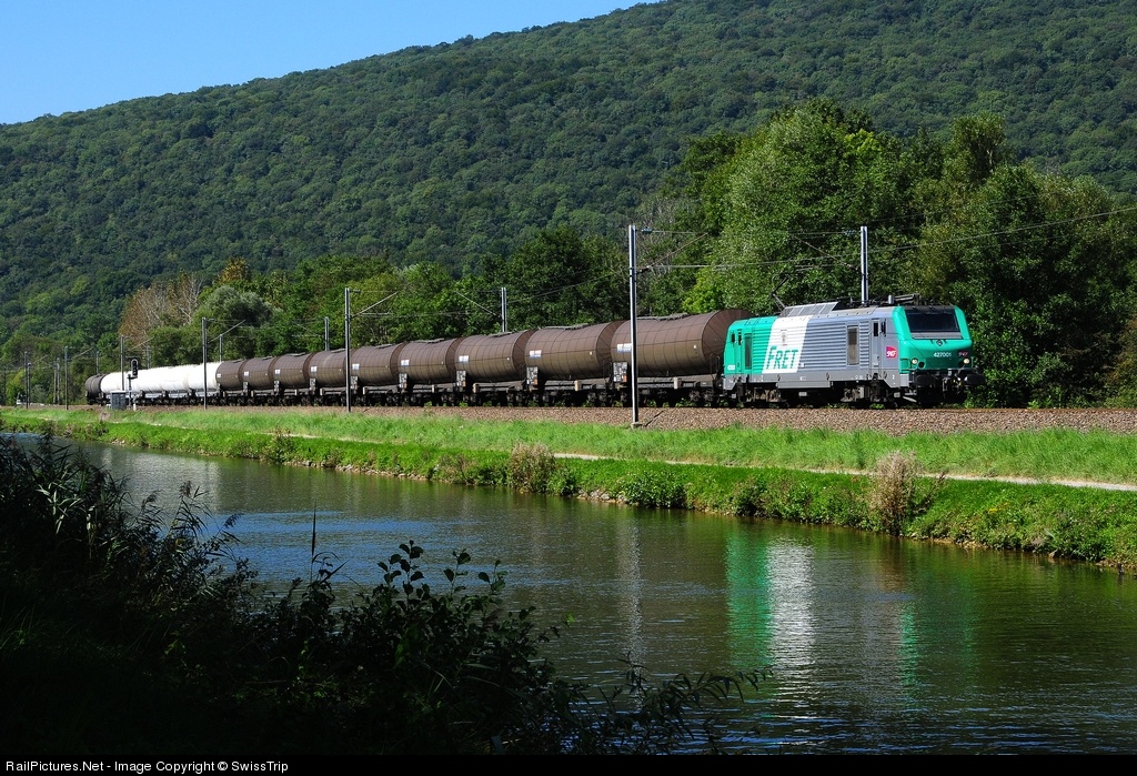 One hundred and eighty of the locomotives, numbered 27001 - 27180, were built for Fret SNCF, for use on freight traffic. Here, the first unit of this type pulls a tank train along the boat channel of river Doubs near Branne.