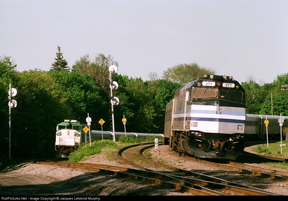 On the left, behind one of the ex-GO now RBRX units, inbound AMT 84 from Candiac and Delson works up the South Junction Lead Sub towards the station at Montreal West. On the right, deadheading AMT 41 shoves out towards Beaconsfield, where it will turn around and become AMT 40. Thanks to J-F Dumont for the train info.
