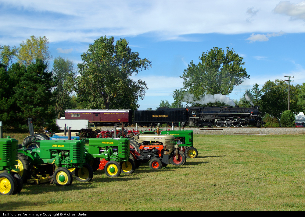 NKP 765 slows to a stop at the W&LE yard office at Harland Station, Ohio passing a nice tractor collection.