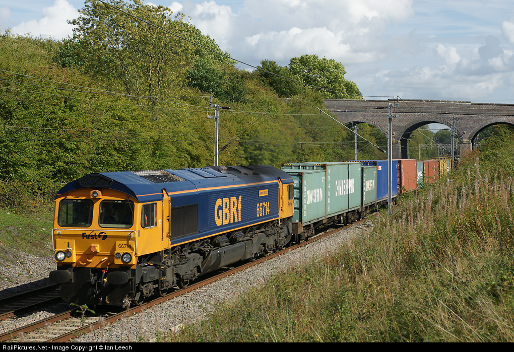 The Felixstowe to Hams Hall liner train passes Great Brington behind 66714 'Cromer Lifeboat'.
