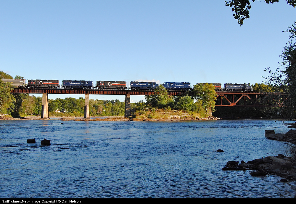 With seven units, WA-2 approaches its destination of Waterville Yard as it crosses the Kennebec.