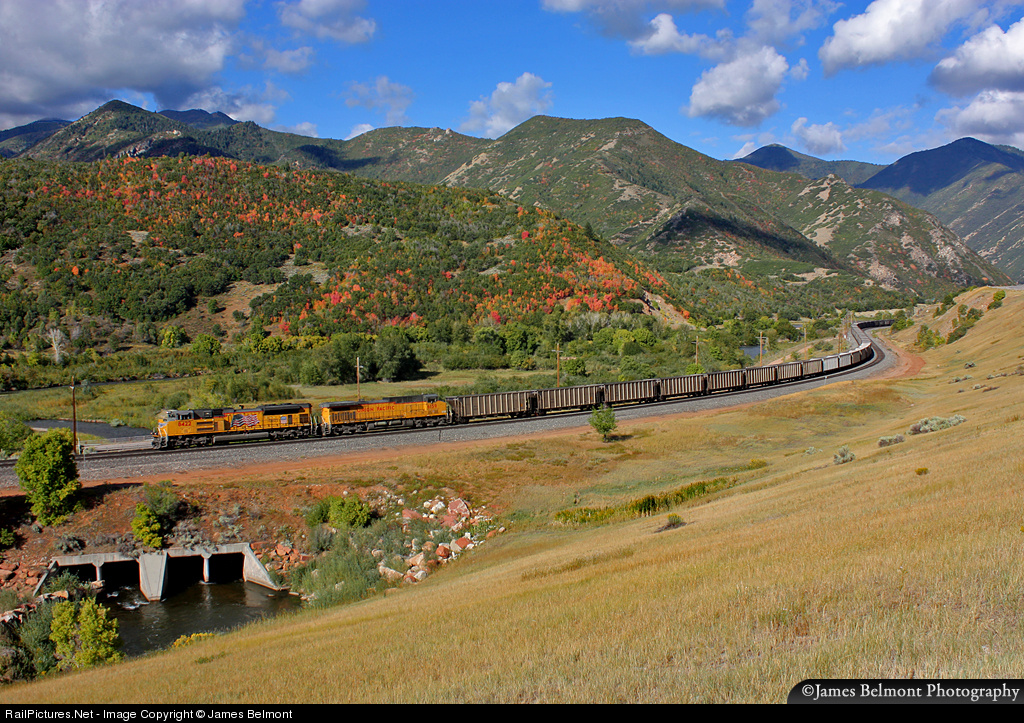 The scrub oak leaves along the hillsides of Spanish Fork Canyon have begun to turn, so the cooler temperatures of the autumn season are eminent. UP's Valmy, Nevada to Skyline, Utah coal empty heads east across Diamond Fork a mile or two east of Castilla.