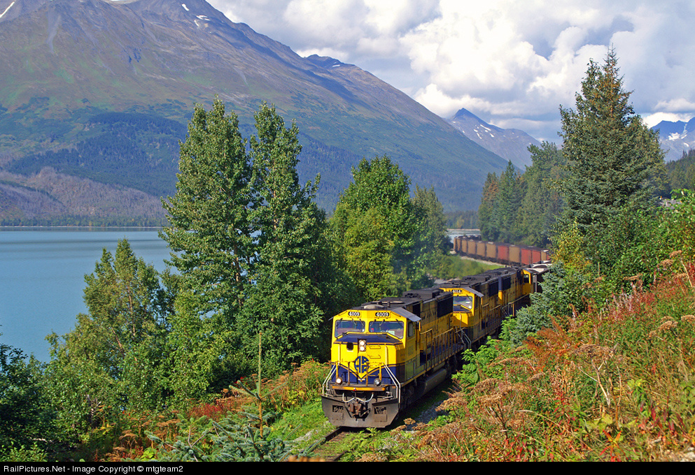 | Alaska Railroad 4009 is the lead unit on a coal train bound for export at the year round port of Seward. The train winds its way around Kenai Lake for more than a few miles on its journey south. |