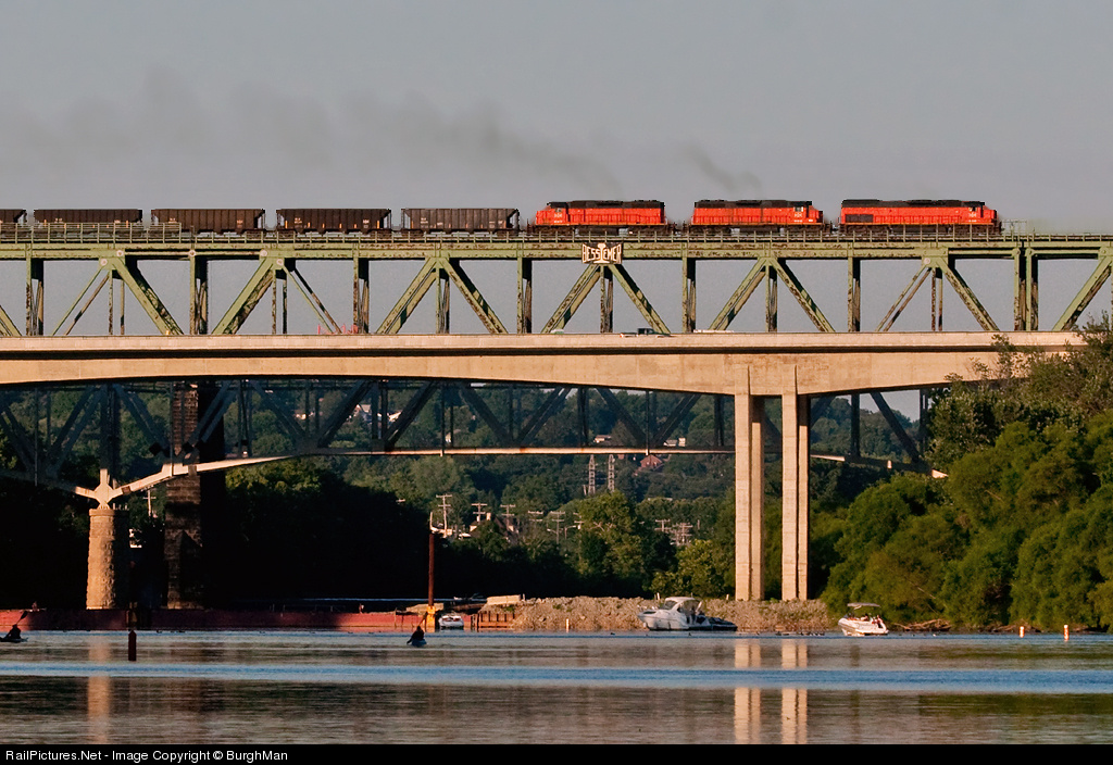 | The CN may be in control, but the engines and the bridge still say B&LE. A Tunnelmotor and two SD38's lead a southbound ore train over the Allegheny River on a summer evening. |