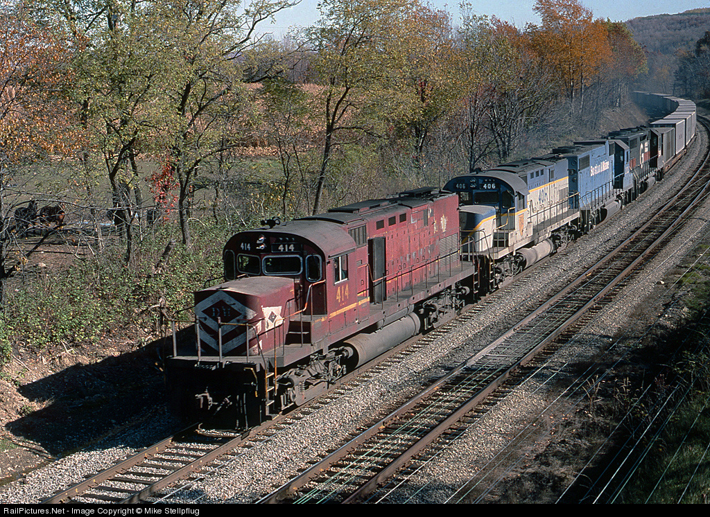 A Westbound SeaLand train has D&H 414 leading, still in LV paint after over 9 years of D&H & Guilford service.