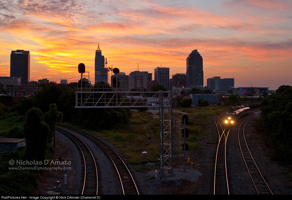 It's still awfully quiet on the outskirts of downtown Raleigh before 7am. Quiet, that is, except for the punctual double-shot on the horn and the whine of the locomotive smoothly accelerating it's short passenger consist up to track speed. An on-time departure from the capital city.