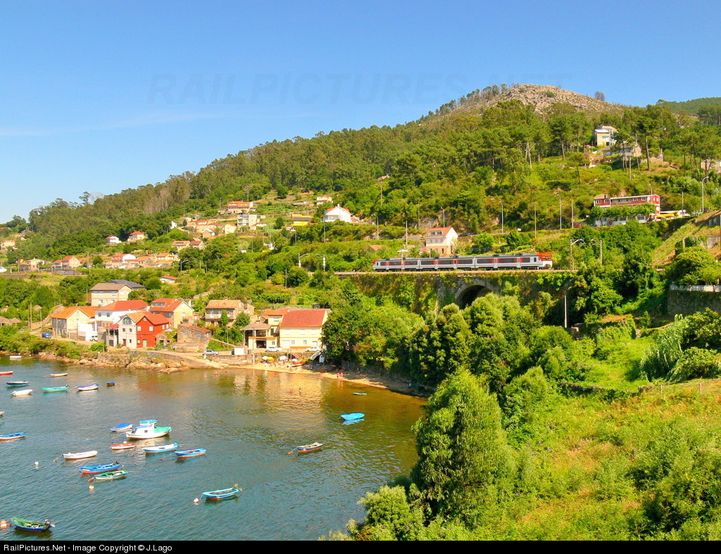 | Commuter service from Pontevedra to Vigo crosses this one special landscape of Vigo`s bay on it`s way to next station, Chapela. Now this kind of train be replaced for the new 599 class made by Caf. |