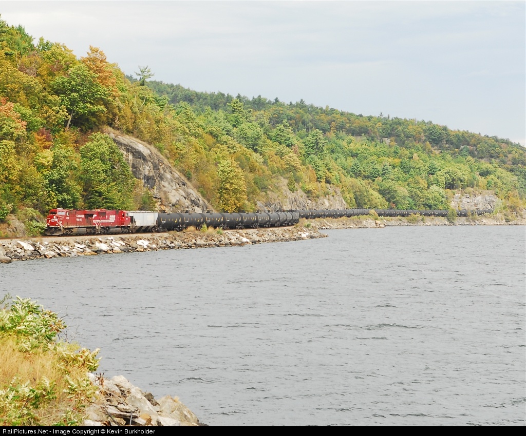 | Stretched out like a black snake along the shore of Lake Champlain, Canadian Pacific train 666-017 heads southbound to inerchange the 80 cars of ethanol to Vermont Rail System in Whitehall, NY behind CP ES44AC 8729 and Soo SD60M 6061. |