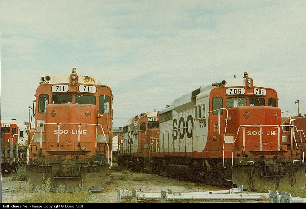 | The economic downturn of the early '80s put many of the SOO's GP30's into storage. Here the 704,706,711 & 720 await their return to duty. |