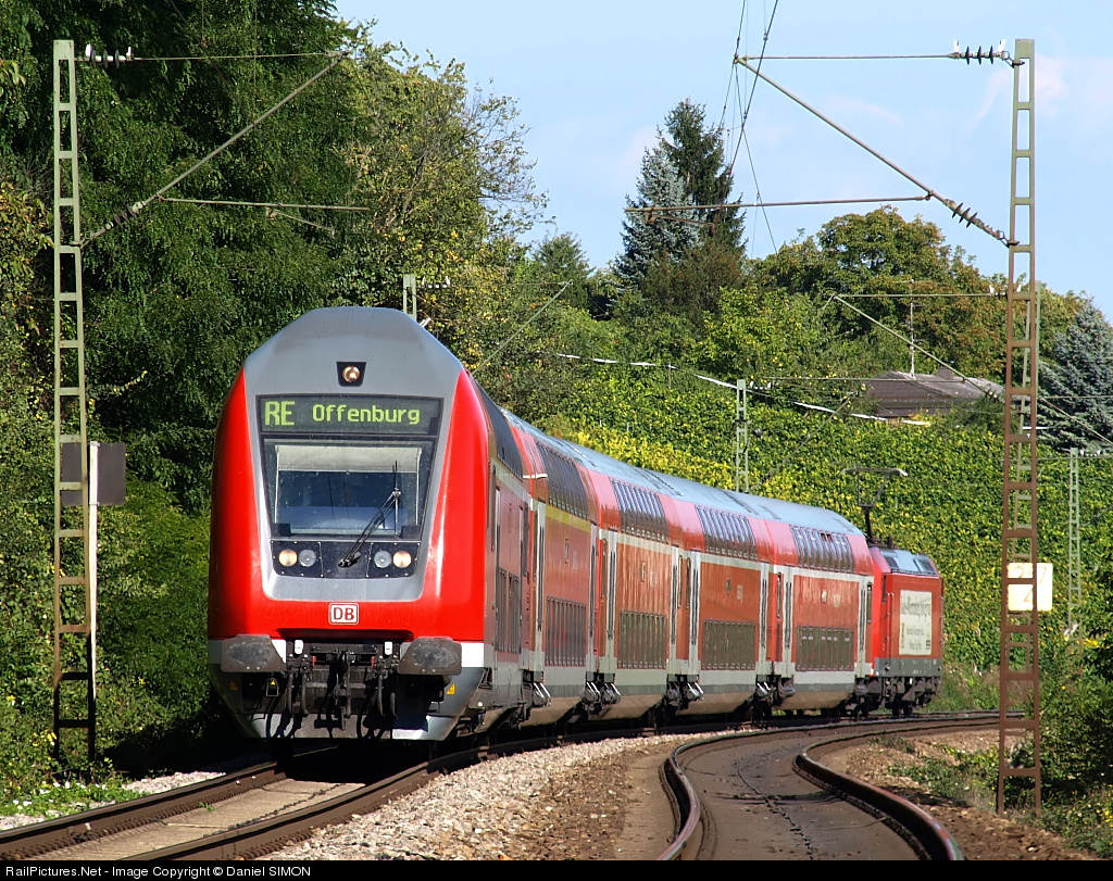 | A RegioExpress double-decker passenger train coming from Basel with final destination Offenburg has just left the station of Efringen Kirchen. These push pull operated regional trains are hauled by Bo-Bo locomotives of the class 146. |