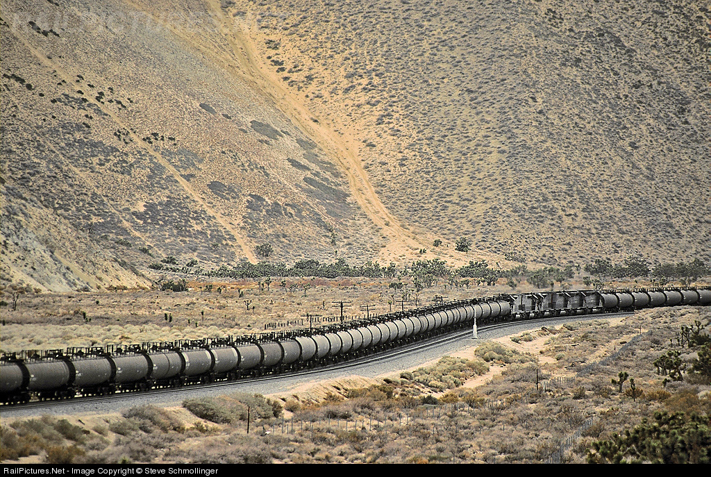 An all-EMD helper assists in holding back 10,000 tons of crude oil as an SP BKDOU descends the eastern slope of Tehachapi Pass.