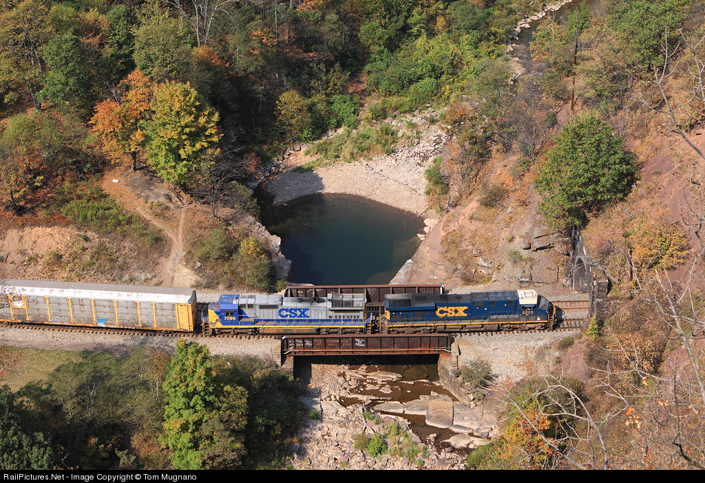 | Q226-21 is about to enter Falls Cut Tunnel, the swimming hole is almost 1/2 empty and Wills Creek is at a standstill with very little rain around the region CSX 5213 & CSX 7596 |