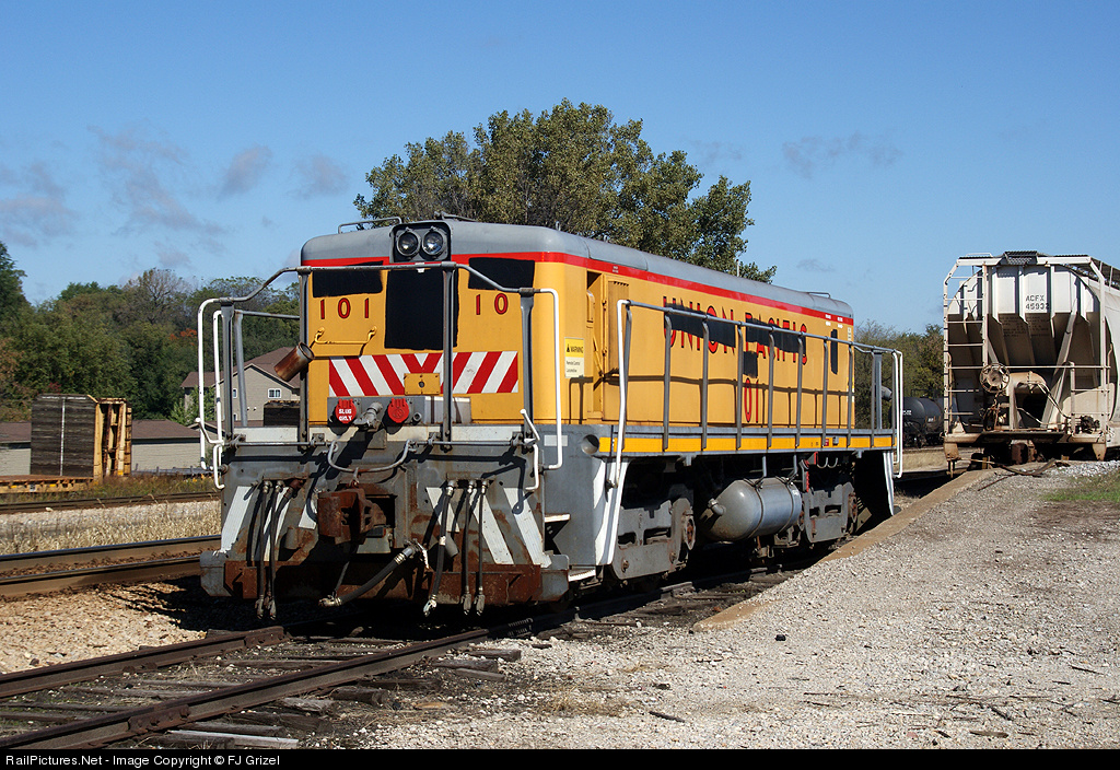A "retired" stencil painted on the side and the UP blacked out on ex-Up 101 tells the story for what may be the end for this Control Cab Remote Control Locomotive unit as it sits on a siding Cedar Rapids. 101 is one of five units built from MP SW7's and was originally MP 1417.