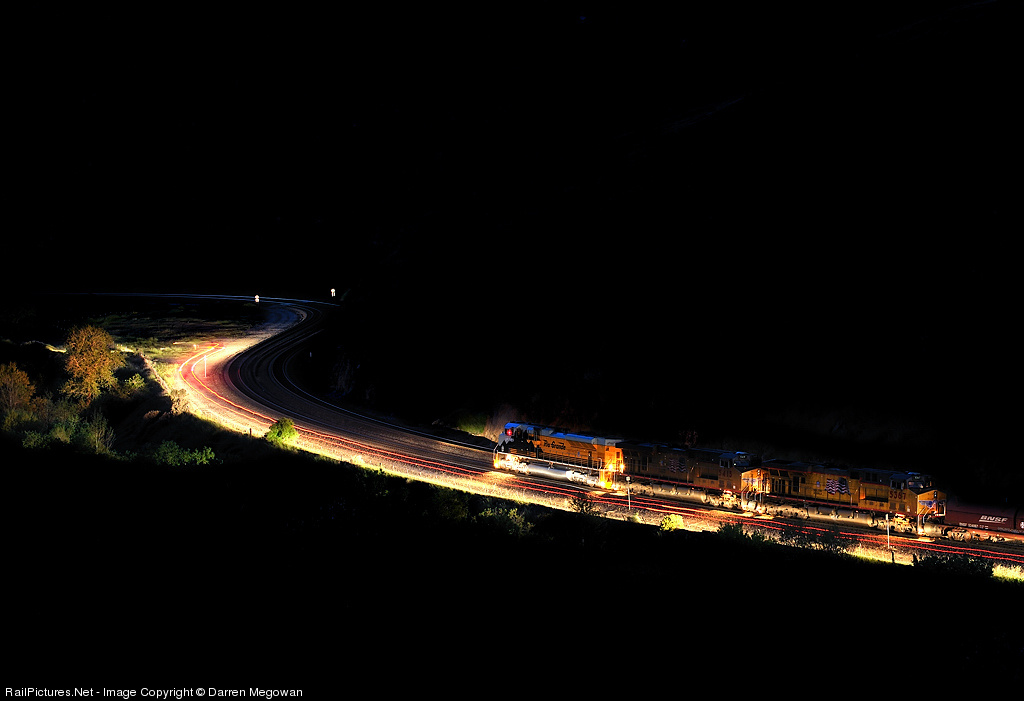 | Stopped in the canyon below Caliente, the train's conductor begins the long walk back to check for a defect on one of the cars. Meanwhile, BNSF's rapid responder shows up to lend assistance illuminating the scene with his vehicle's lights. |