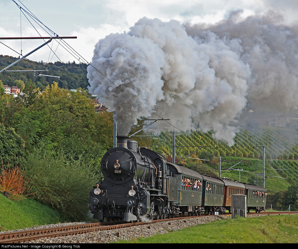 | On the second day of the celebration for the anniversary of 150 years railway Neuchâtel-Pontarlier, C 5/6 2978 pulled a 4 car train from Neuchâtel up to Travers and St-Sulpice. The train is just at the beginning of the 2.4 % grade towards the Travers valley. |