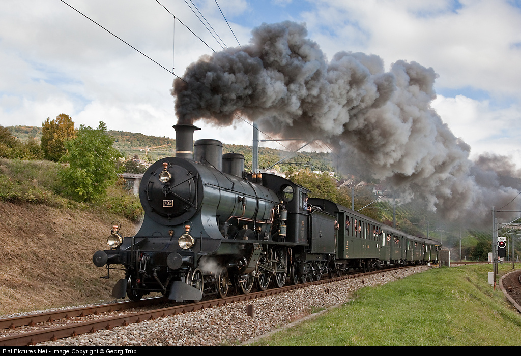 | On the second day of the celebration for the anniversary of 150 years railway Neuchâtel-Pontarlier, the elegant 4 cylinder compound express train steamlocomotive A 3/5 705 (4-6-0, system de Glehn) pulled a train from Neuchâtel up the 2.4 % grade to Les Verrières at the Swiss/France border. |