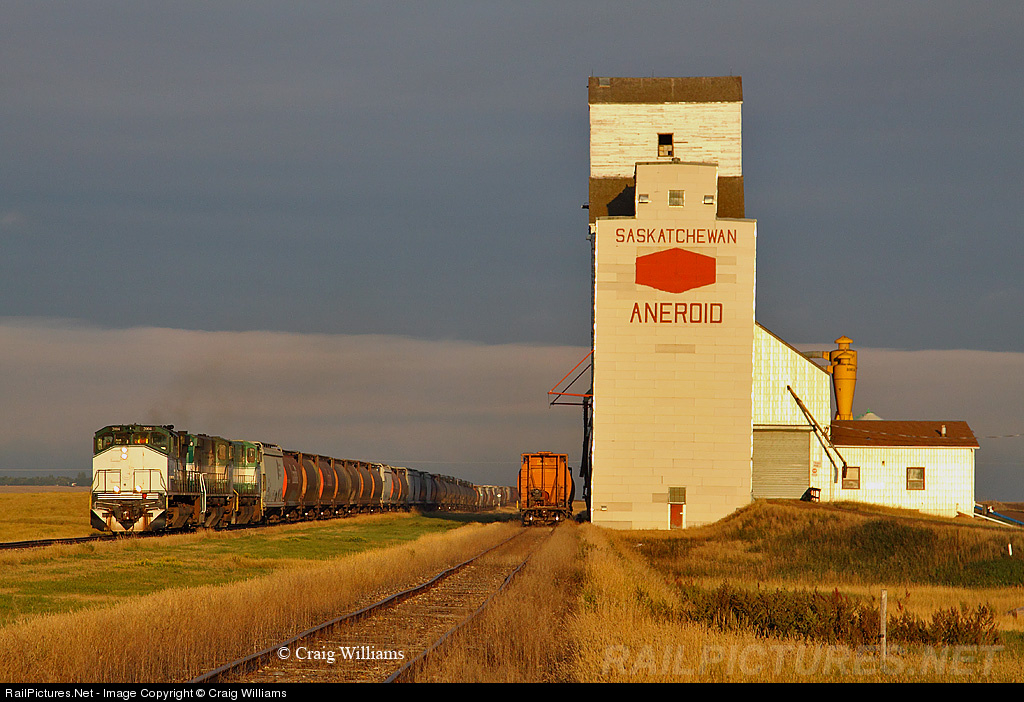 | The Great Western prepares to stop to pickup 3 cars as they make their way back to Assinibola with a loaded grain train for the CP. These cars left empty on Tuesday out of Assiniboia and were distributed to 15 or so different elevators along the way to Bracken, SK. Now the job works eastbound to gets all the loads picked up. A small hole in the clouds is allowing nice sunrise light for a short time. |