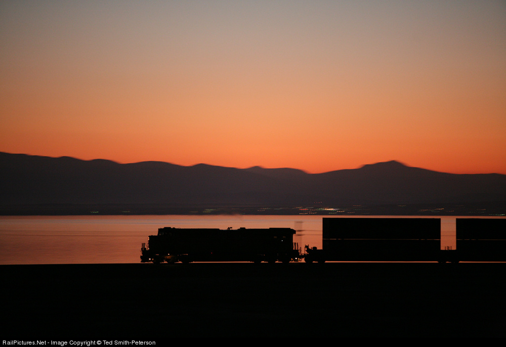 A fast moving westbound intermodal's rear DPU pushes against the train ahead as it passes the siding of Bertram at dusk. Across the water the lights of Salton City begin to shine along the west bank of the Salton Sea.
