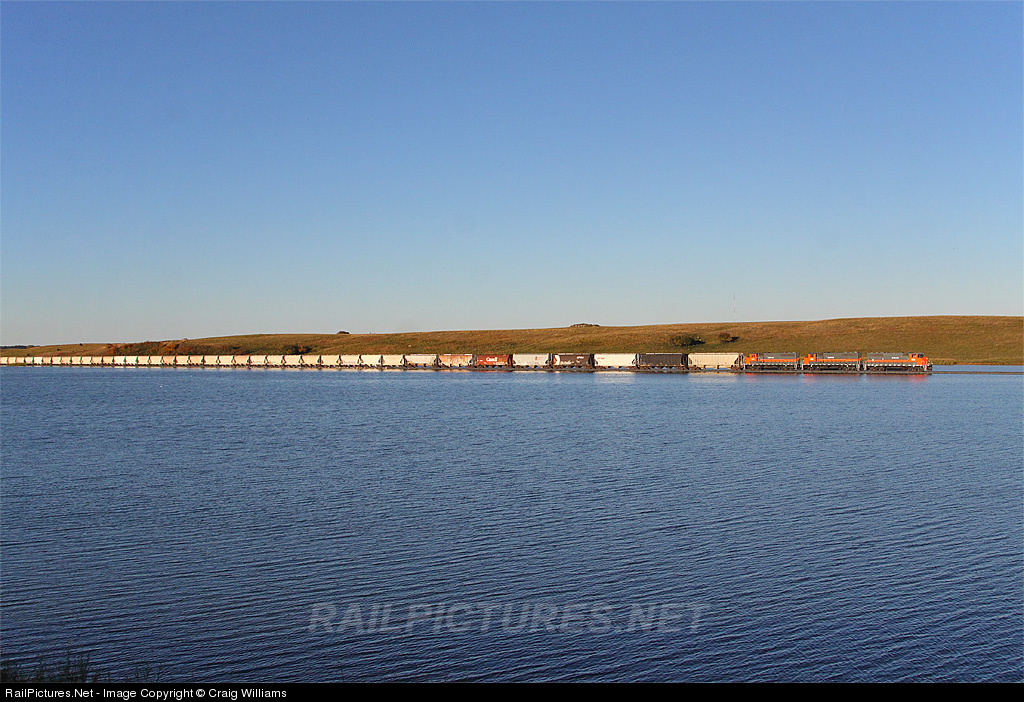 The northbound local to Max, ND, didnt make to Max on Monday, so today they were still northbound in the morning. Here the train creeps along at 10mph a few miles North of Garrison as they cross one of many small lakes along DMVW mainlines.
