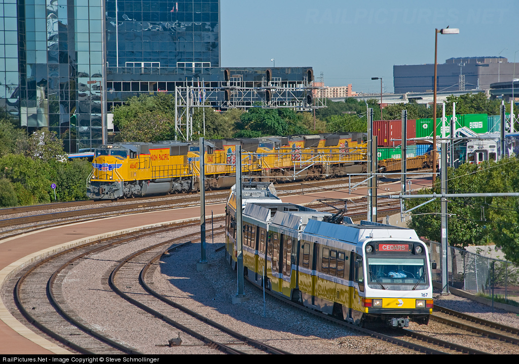 Freshly painted SD70M No. 4647 leads an eastbound UP stack train through Reunion as a DART train departs Dallas UPT.