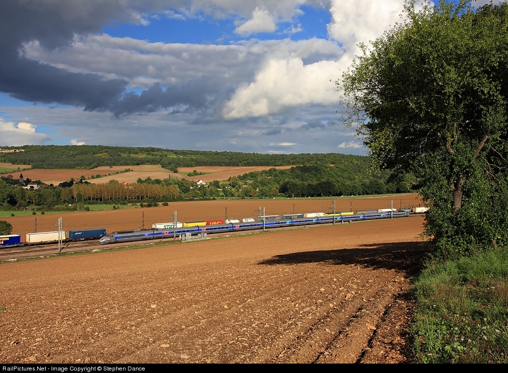 | A TGV starts the climb up the steeply graded connecting line from the classic line between Dijon and Paris at Buffon towards the LGV line from Lyon to Paris a few kilometres away at Soulangy as an intermodal service passes in the other direction. A day of cloud and showers had turned into a warm and mainly sunny evening, ideal for photography from high on the valley side. |