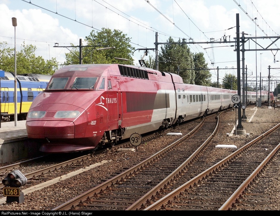 French built Thalys TGV-trainset 4533 enters Dordrecht Station at the Paris-Amsterdam service